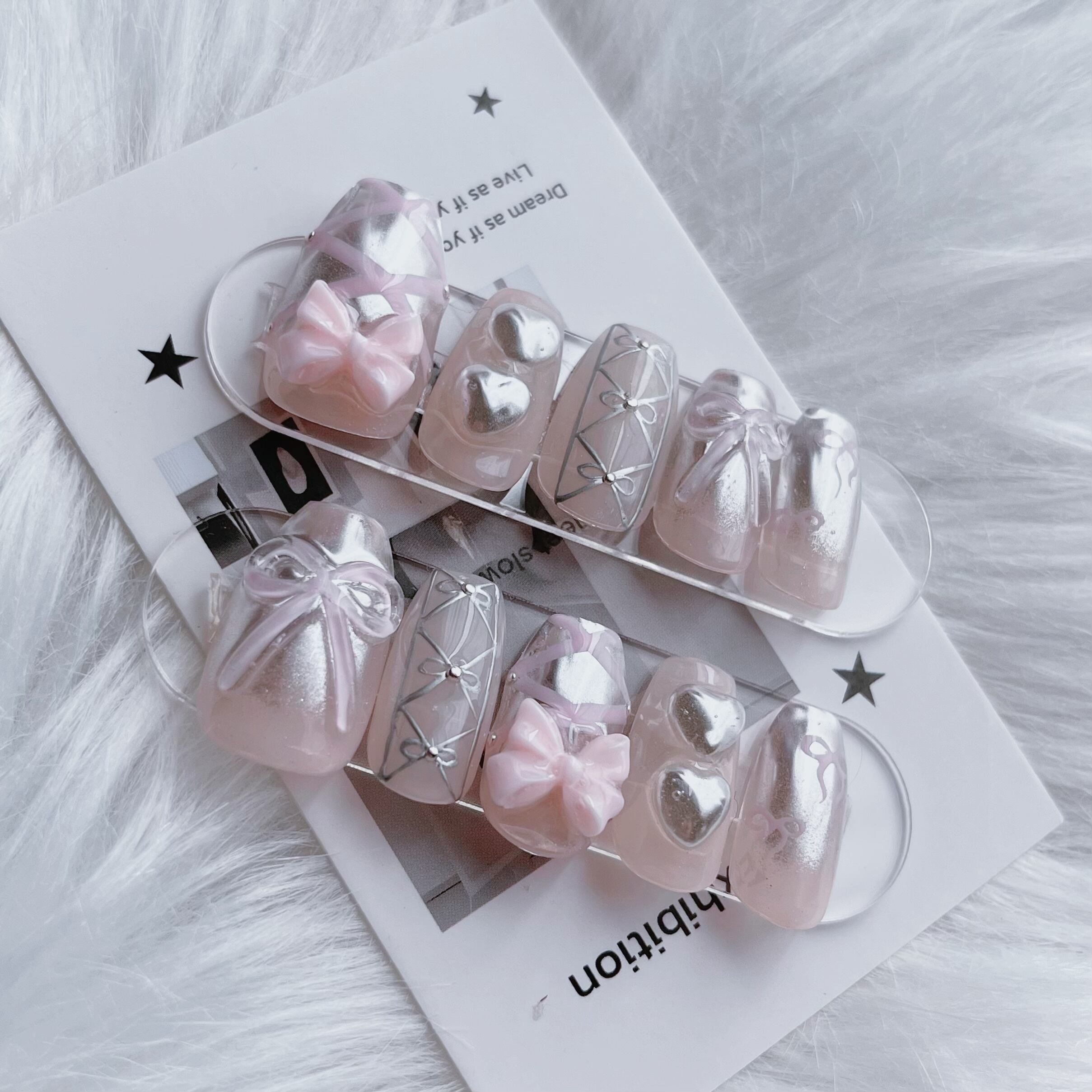 ballerina ✩.*˚ ネイルチップ,リボンネイルチップ,y2kネイル,シルバーネイル,